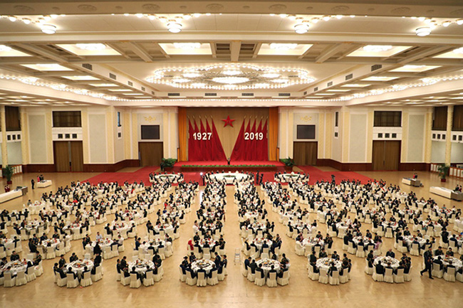 人民大會(huì)堂燈火輝煌,中外嘉賓歡聚一堂。主席臺(tái)帷幕中央懸掛著巨型“八一”軍徽,兩旁是十面鮮艷的紅旗。“1927-2019”醒目的大字熠熠生輝,昭示著中國人民解放軍走過92年不平凡歲月。